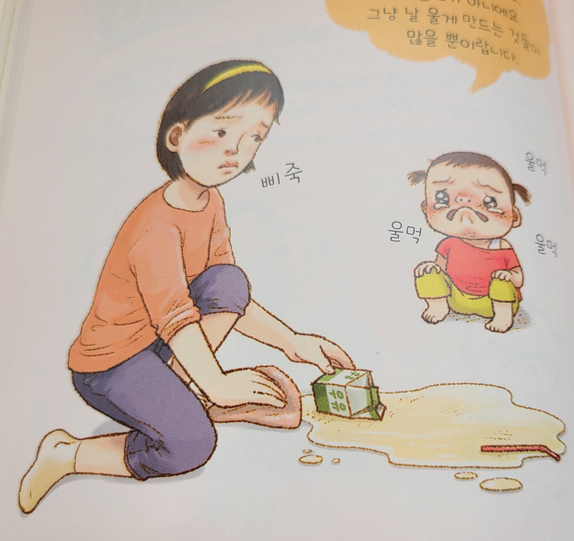 : 우유나 물을 쏟아 놓고 그렇게 서럽게 우신다... 울고 싶은 사람은 닦는 나인데... 이 경우 큰 소리로 다그치지 말고 조용하고 차분한 목소리로 말해주어야 한다고 나와있다. 아기들은 자신의 감정을 모르기 때문에 따뜻하게 안아주고 우는 이유를 물어보는게 좋다고 한다. (실천이 잘 안된다 😭ㅎㅎ)