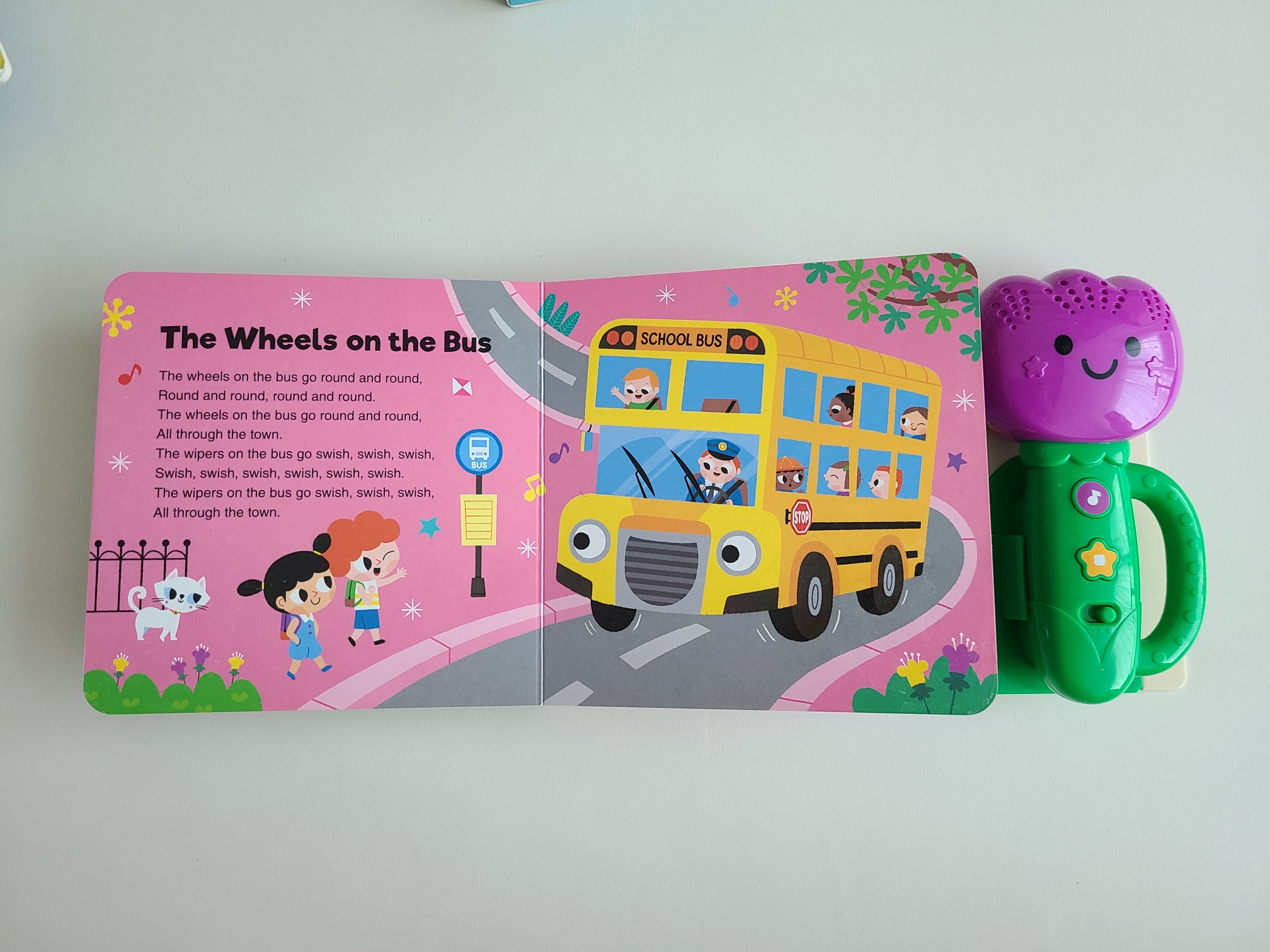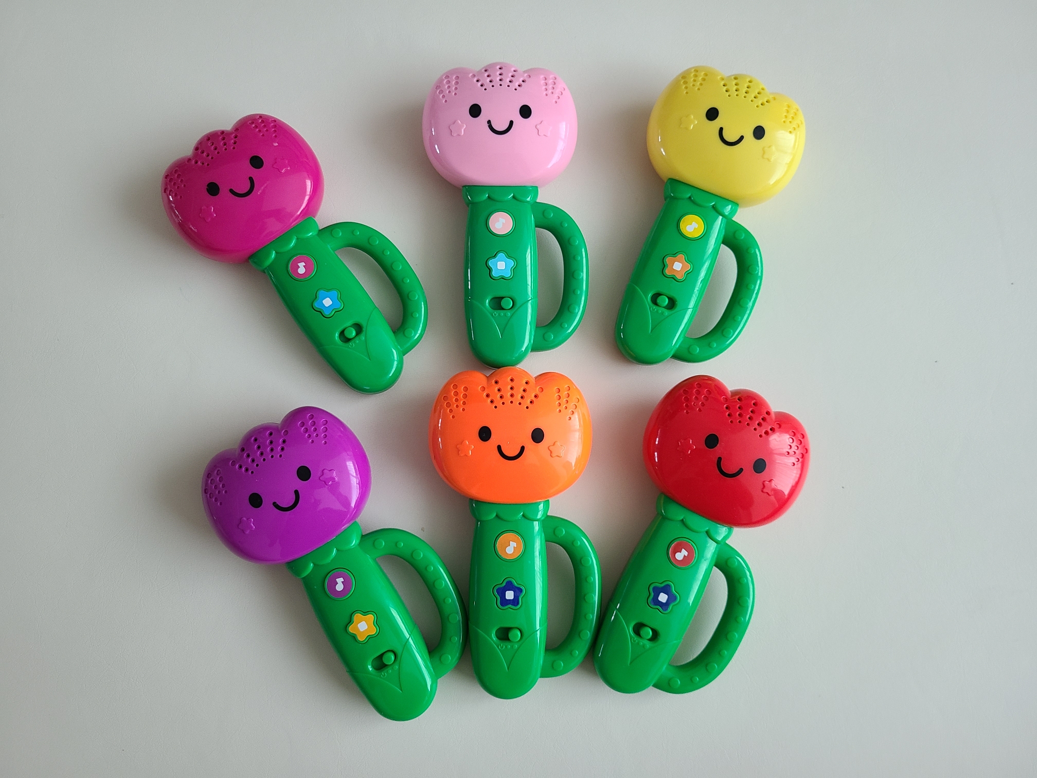 노래가 나올 때 꽃이 번쩍이고 흔들면 딸랑이 소리(곡마다 다른 소리가 난다)가 나서 신생아 시절부터 보여줬었다.