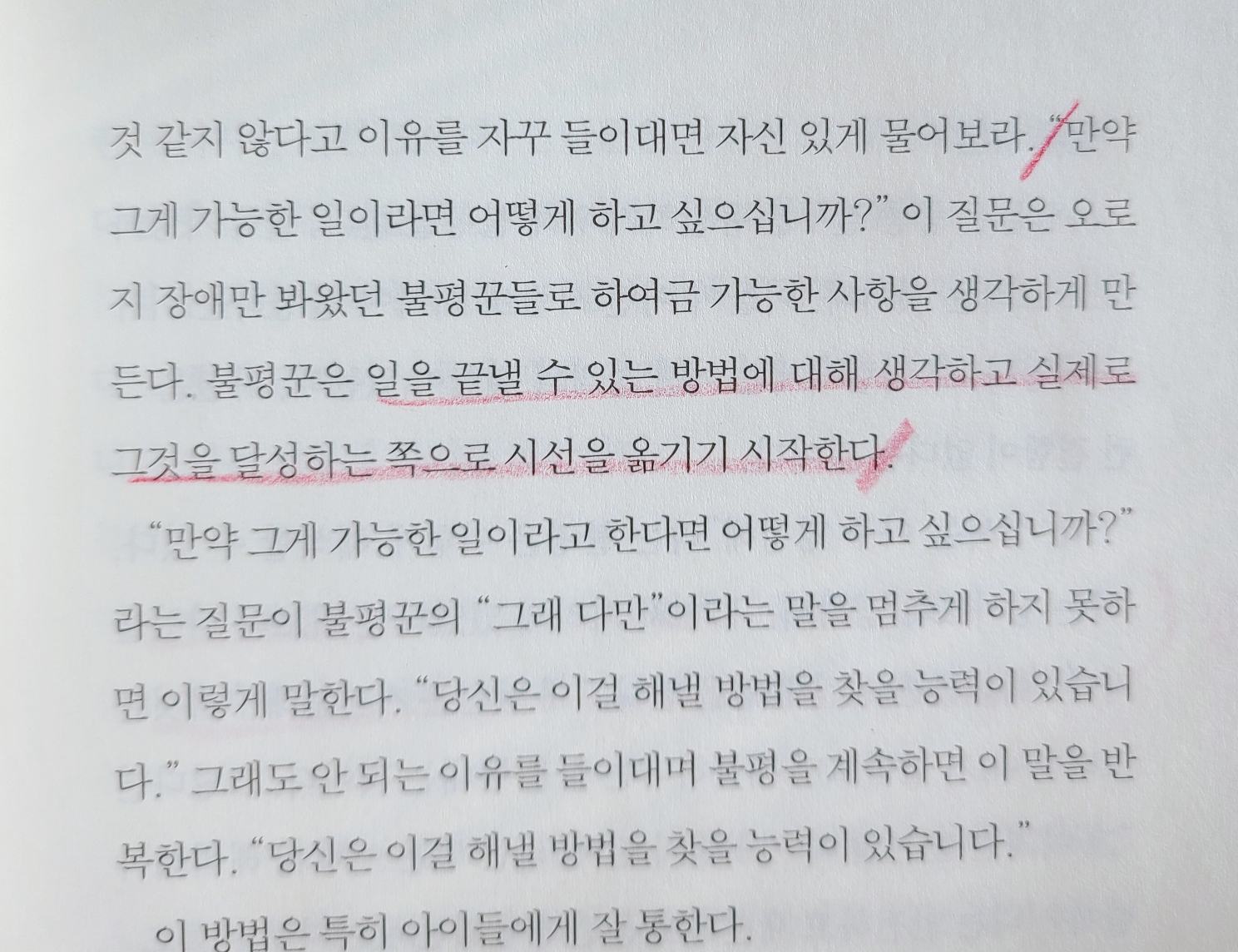 그렇지만 이것과 조금 다른 관점에서 습관화된 불평 불만이 얼마나 쓸데없고 부정적인 인생의 자세를 불러오며, 타인도 힘들게 하고, 결정적으로 현실 개선에 아무 도움이 되지 않는다는 점을 인지시켜준다는 점에서 좋았다.