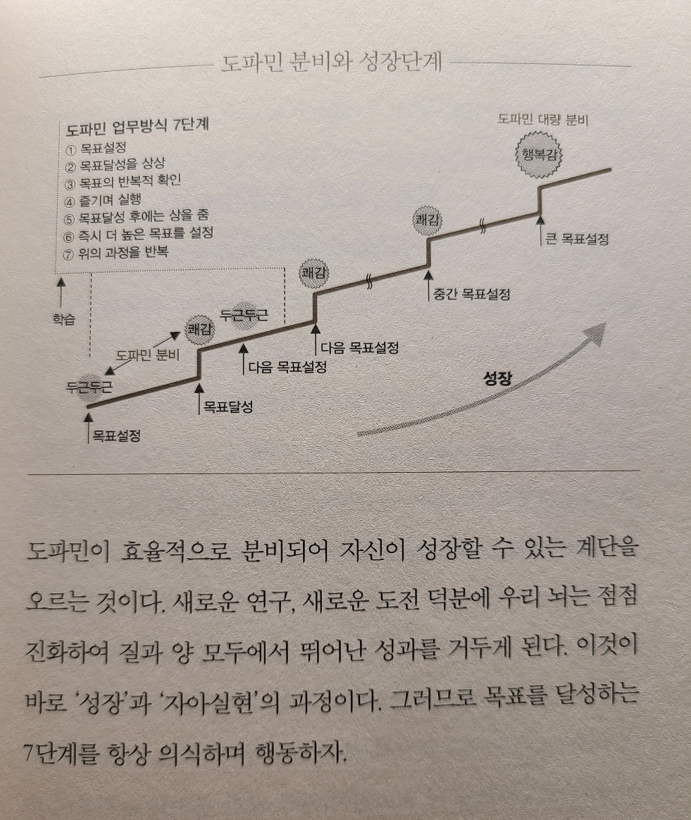 뇌에서 도파민이 분비되면 의욕이 솟고 행복함을 느낄 수 있다고 하는데요. 도파민이 분비되는 방법은 여러 가지가 있지만 (운동, 새로운 방식으로 일하기, 칭찬 받기, 보상 획득 등) 장기적으로 가장 유익한 것은 목표세우기과 목표 달성입니다.