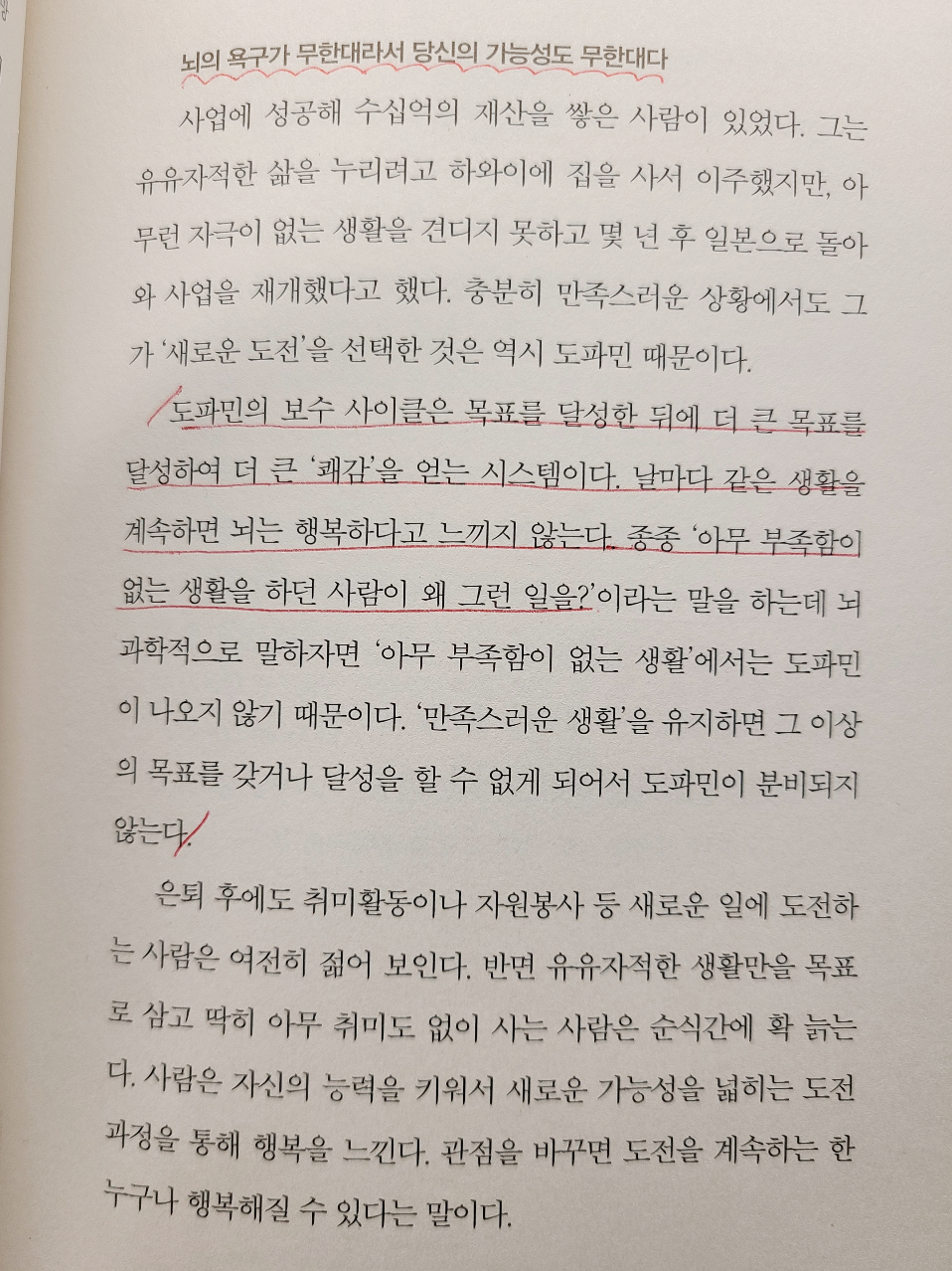 원하는 것을 다 이루고 재산도 많이 쌓은 사업가가, 자신이 일군 ‘만족스러운 삶’을 유지하고 살아가는 것이 행복하지만은 않았다는 부분이 너무 충격적이지 않나요? 뇌 과학적인 측면에서는 ‘아무 부족함이 없는 생활’에서는 뇌 내의 행복물질인 ‘도파민’이 분비되지 않는다고 합니다.